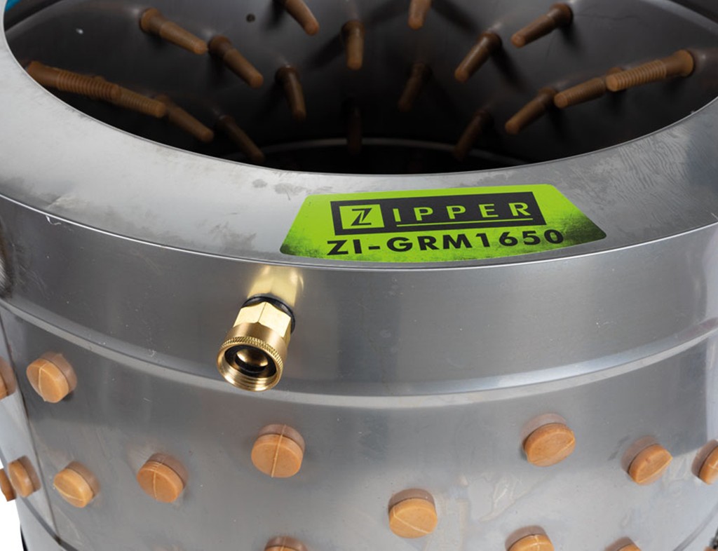 Ta skubarka ze stali nierdzewnej posiada pierścień do płukania pod górną krawędzią. Dzięki temu skubarka jest jeszcze łatwiejsza w użyciu i nie musisz stać przy niej i płukać piór podczas skubania. Możesz wtedy zająć się innymi czynnościami lub przygotować kolejnego ptaka do skubania, podczas gdy system płukania skubarki wykona pracę za Ciebie. Płukanie podczas skubania nie tylko usuwa brud z oskubanego ptaka, ale także usprawnia proces skubania, zapobiega rozdarciom skóry i ułatwia skubanie mokrych piór. Wystarczy podłączyć wąż do zaworu skubarki , odkręcić wodę i można skubać.