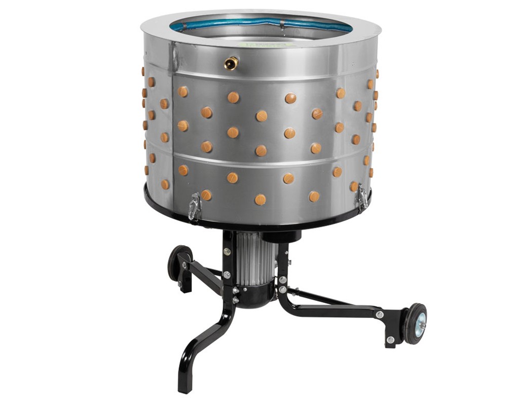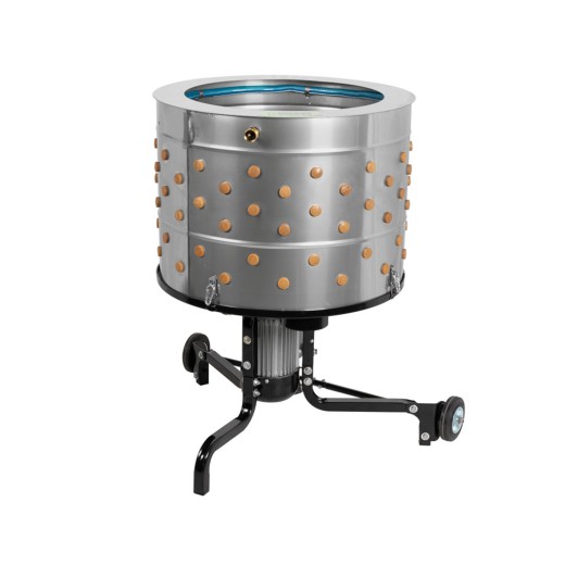 Bębnowa skubaczka do drobiu ze stali nierdzewnej , do kur, gęsi, kaczek, indyków, pojemność 2 sztuk drobiu, maks. 10 kg, pierścień płuczący do mycia wyrwanych piór, bezobsługowy silnik o mocy 1300 W , prędkość 300 obr./min, 158 palców skubiących , proste i szybkie czyszczenie, gumowe koła z łożyskami kulkowymi , wysokość bębna 480 mm x średnica bębna 650 mm, otwór bębna Ø 500 mm, wymiary skubaczki: 780 x 726 x 904 mm.