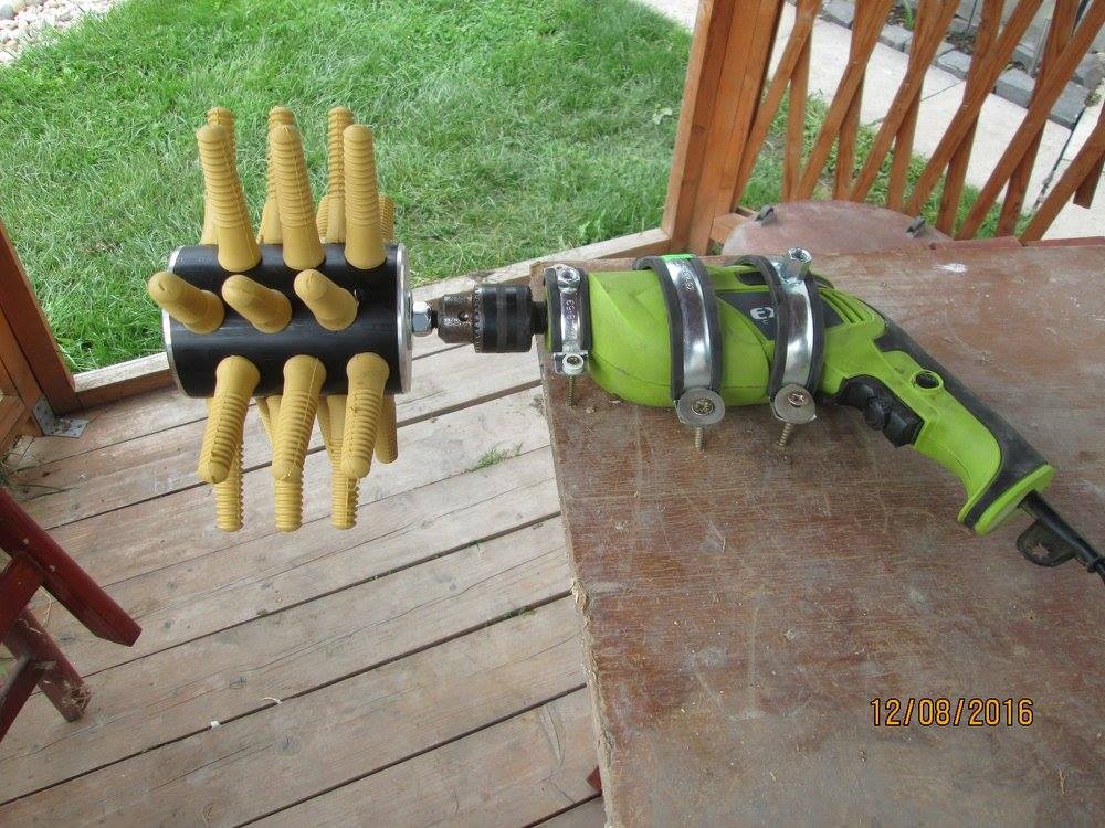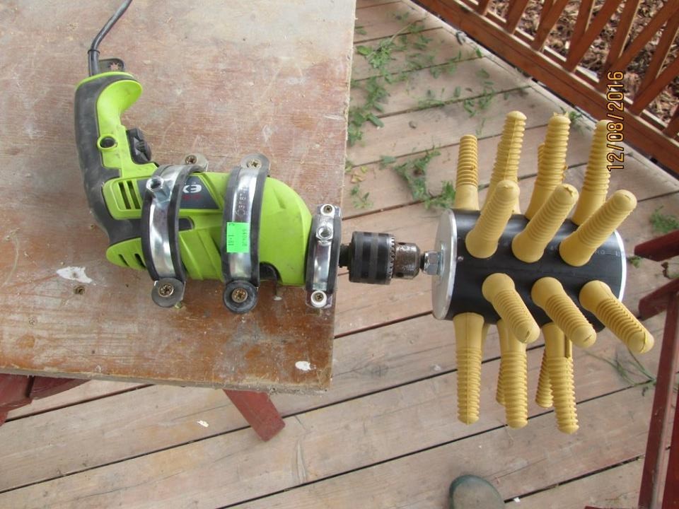 Aby produkt działał prawidłowo , należy go przymocować do urządzenia (zaleca się wiertarkę – nie jest dołączona do zestawu) , które będzie obracać się wraz z produktem . Zalecamy przymocowanie urządzenia, które będzie używane do obracania , do powierzchni roboczej (na przykład do stołu) za pomocą tulei zaciskowych lub zacisków, patrz rysunek poniżej.