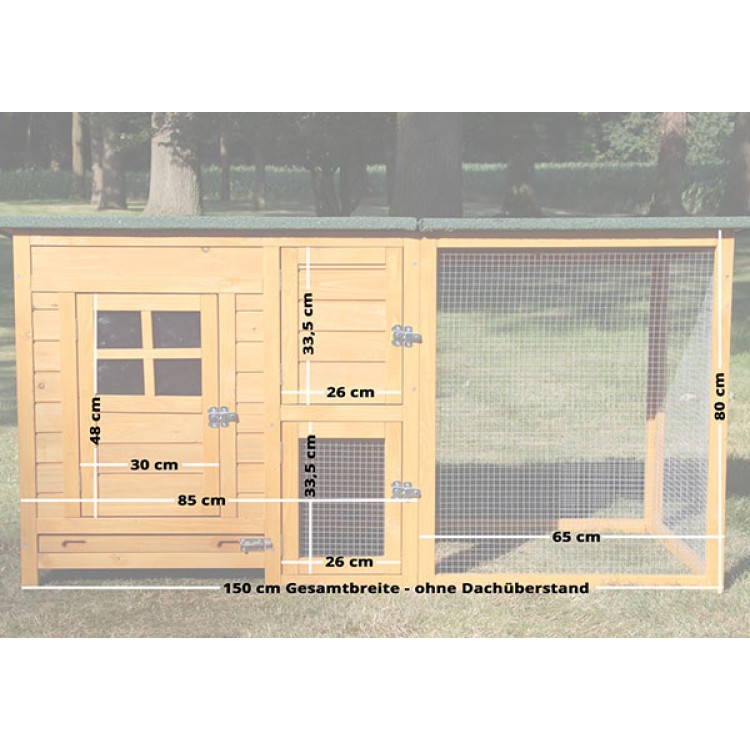 Nasza rekomendacja: Kurnik jest zabezpieczony podkładem ochronnym. Aby przedłużyć jego żywotność, zalecamy regularną wymianę powłoki ochronnej. Kurnik powinien być idealnie umiejscowiony w miejscu chronionym przed niekorzystnymi warunkami atmosferycznymi, takimi jak deszcz, śnieg, silne nasłonecznienie i wiatr.