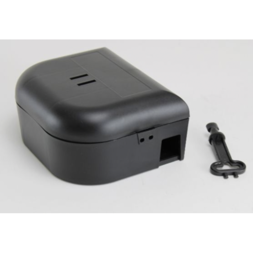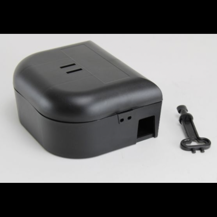Skrzynka na gryzonie do umieszczania trujących przynęt na myszy. Przynęta na myszy jest niedostępna dla zwierząt domowych i dzieci, a skrzynkę można otworzyć tylko za pomocą odpowiedniego klucza.
