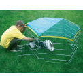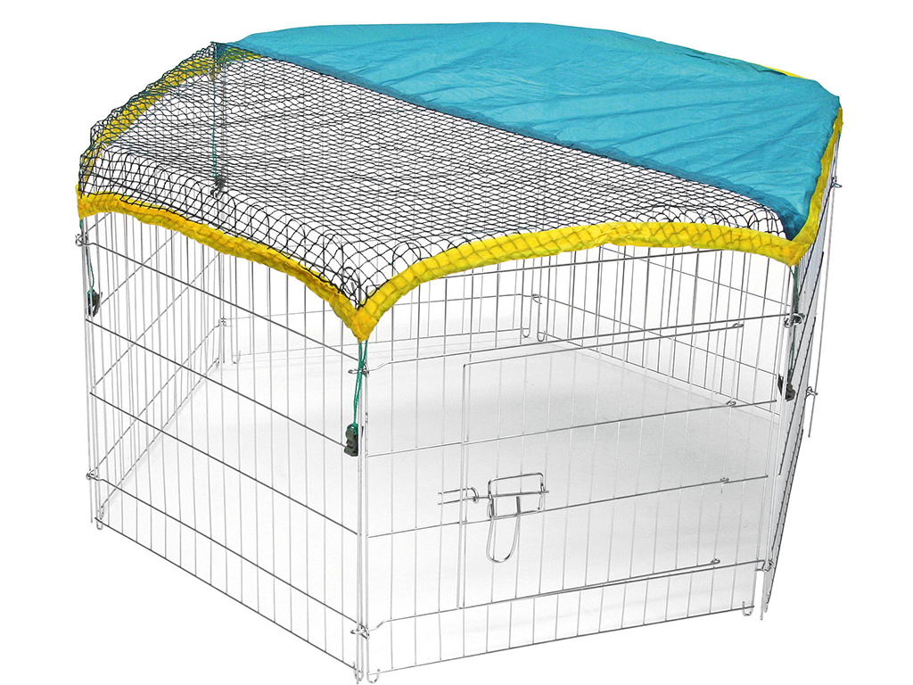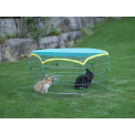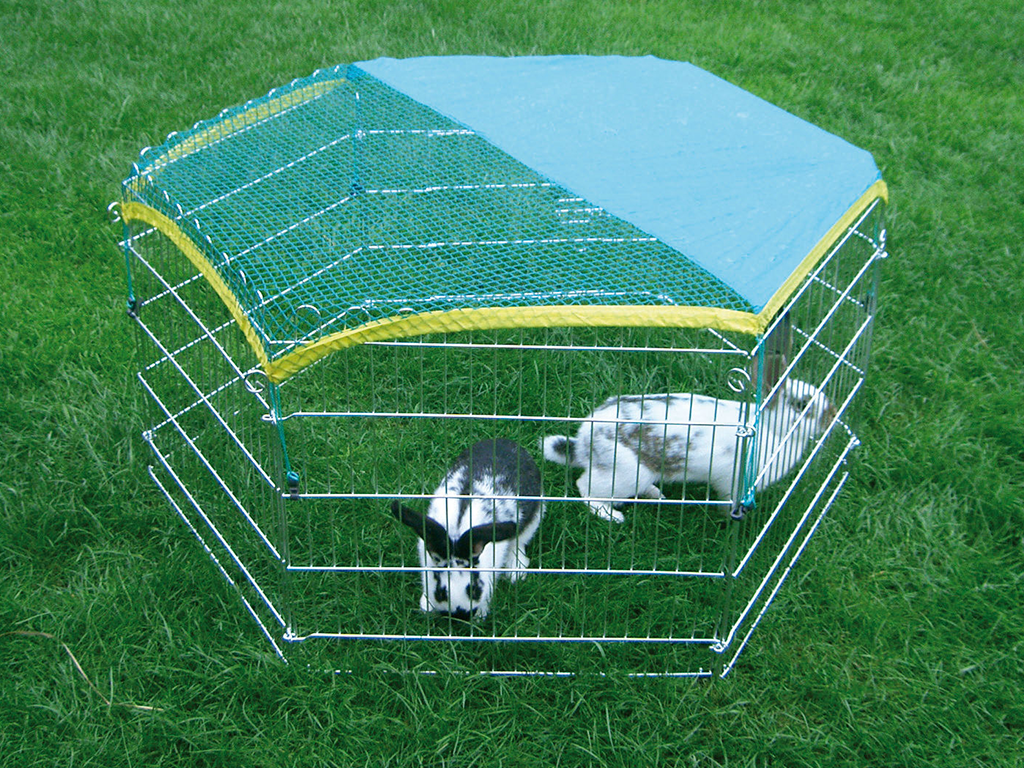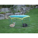 Wybieg dla królików i innych gryzoni , sześć ścianek o wymiarach 56,5 x 56,5 cm . Praktyczny kojec z drzwiczkami i plandeką chroniącą przed słońcem oraz siatką ochronną dla małych zwierząt. Kojec można łatwo składać i rozkładać. Wykonany jest z ocynkowanej blachy .