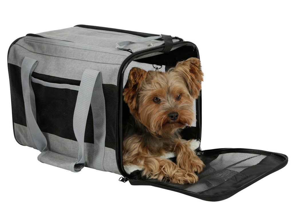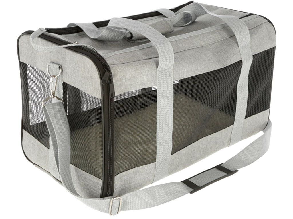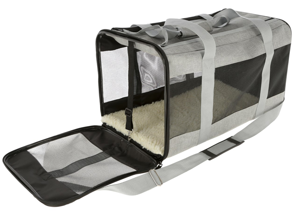Torba podróżna dla psów/kotów o wadze do 12 kg, z regulowanym, odpinanym paskiem, wzmocnionym i wyściełanym dnem , odpinanym wewnętrznym pokryciem, wstawkami z siatki chroniącymi przed zadrapaniami, dobrą cyrkulacją powietrza , ze zintegrowaną smyczą, 2 boczne kieszenie zapinane na zamek, wymiary 52x31x31 cm.
