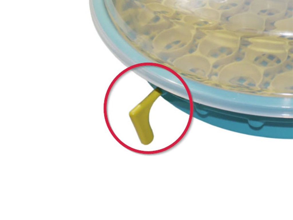 Uchwyt z tworzywa sztucznego przeznaczony do obracającego się rusztu inkubatorów PUISOR , umożliwiający półautomatyczne obracanie jaj za pomocą dźwigni , która obraca jaja umieszczone na obracającym się ruszcie za pomocą ruchu ręki.
