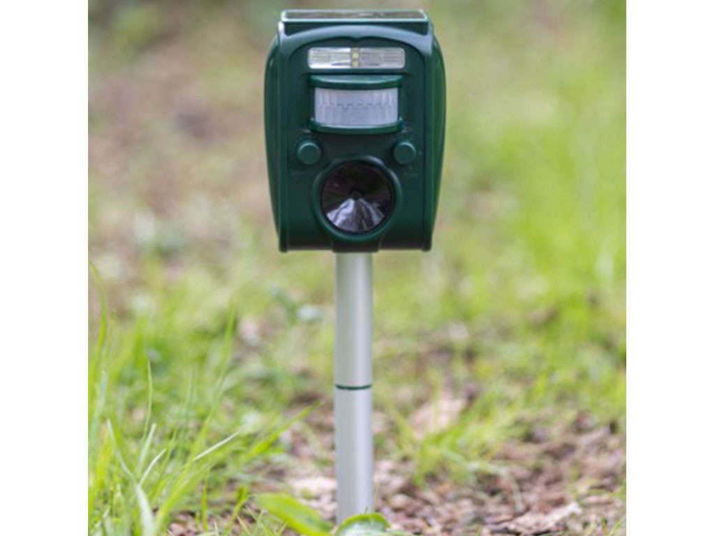 Odstraszacz ultradźwiękowy zasilany energią słoneczną, odpowiedni dla różnych gatunków zwierząt, zaprojektowany do użytku na zewnątrz, zasilany wbudowanym panelem słonecznym, 5 przełączanych typów odstraszania, regulowana intensywność odstraszania, inteligentna technologia ultradźwiękowa, przełączane migające światło LED, czujnik ruchu reagujący na ciepło ciała, skuteczny obszar do 70 m2, z zasięgiem 8 m pod kątem 110°, kolec do zakotwiczenia w podłożu, trwała plastikowa obudowa.