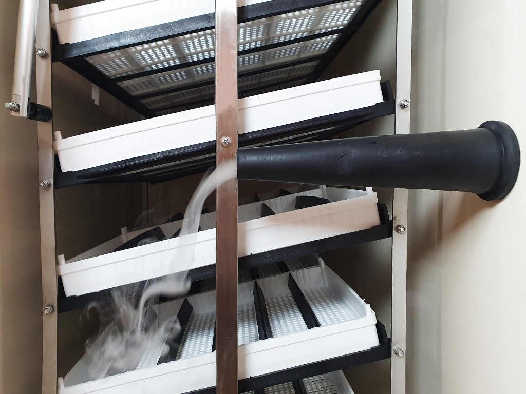 Jaja w inkubatorze są obracane za pomocą automatycznego systemu TurnX. System ten zapewnia regularne i bardzo delikatne obracanie jaj w odstępach 1-godzinnych. System TurnX jest wykonany ze stali chromowanej i jest bardzo łatwy w utrzymaniu . Silnik systemu jest zasilany oddzielnym zasilaczem o bardzo niskim zużyciu energii . W zestawie znajdują się uniwersalne kratki do różnych rodzajów jaj. W kratkach tych można wylęgać jaja o różnych rozmiarach (od przepiórczych po gęsie), które umieszcza się w kratce i mocuje za pomocą przegródek , które oczywiście są dołączone do zestawu – każda kratka zawiera 10 przegródek.