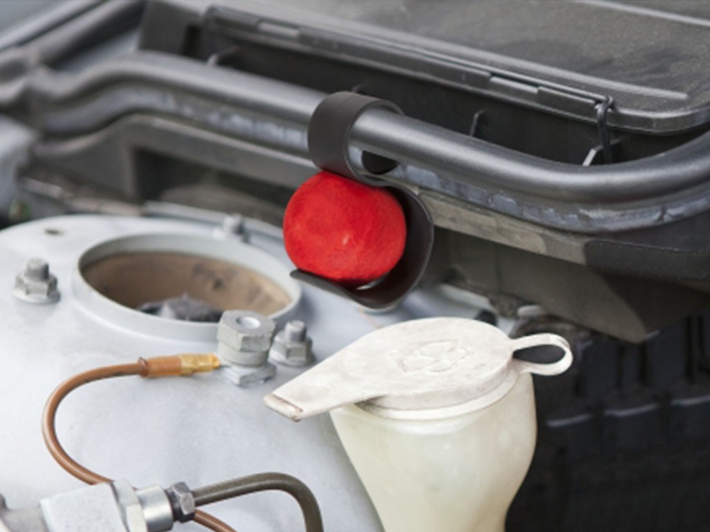 Uważaj, kuny znaczą swoje terytorium moczem , dlatego zawsze dokładnie wyczyść/umyj komorę silnika przed montażem uchwytu . Uchwytu z kulką odstraszającą zapachy nie należy montować bezpośrednio na lub obok gorącej części komory silnika – istnieje ryzyko poparzenia!