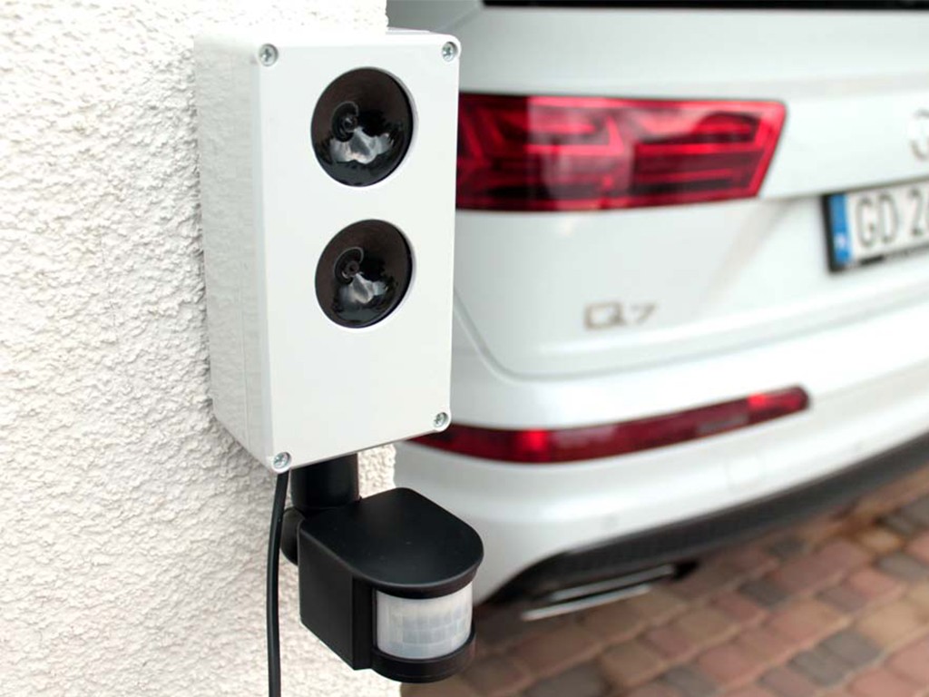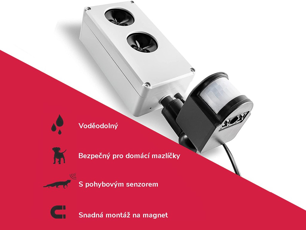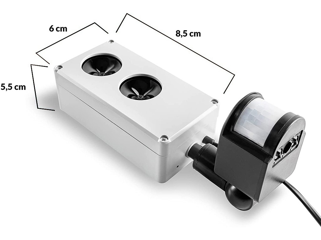 Ultradźwiękowy odstraszacz zwierząt, odpowiedni do odstraszania kun i gryzoni , bezpieczny dla ludzi i zwierząt domowych. Do użytku wewnątrz i na zewnątrz , wyposażony w trwałą, wodoodporną obudowę z możliwością mocowania za pomocą uchwytu magnetycznego . Odstraszacz kun o zakresie tonów 180° z automatyczną zmianą częstotliwości i zasięgiem do 2000 m² , zasilany bezpośrednio z sieci 230 V. Odstraszacz wykorzystuje 2 głośniki membranowe o średnicy 50 mm i regulowany czujnik ruchu. Wymiary odstraszacza ultradźwiękowego 70 x 150 x 55 mm.