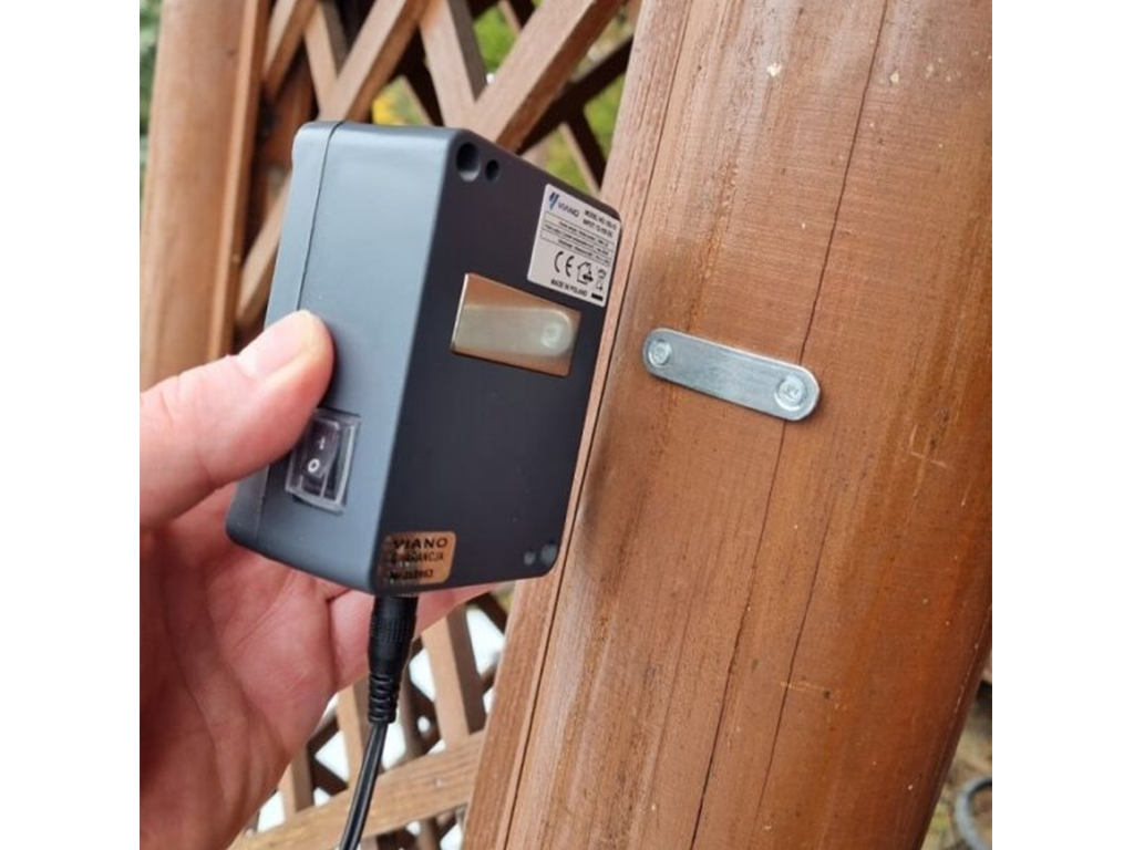 Odstraszacz VIANO można łatwo, szybko i bezpiecznie przymocować do niemal każdej powierzchni za pomocą uchwytu magnetycznego. Odstraszacz jest wyposażony w silny magnes neodymowy, stosowany w przemysłowej technice mocowania. Wystarczy kawałek metalowej powierzchni, np. rura, poręcz, rynna, metalowy parapet, konstrukcja dachu, ogrzewanie itp., aby urządzenie było natychmiast zainstalowane bez konieczności montażu. Jeśli w obszarze objętym zabiegiem nie ma metalowej powierzchni, na której można umieścić odstraszacz, można użyć specjalnej metalowej płytki dołączonej do zestawu. Przykręć metalową płytkę w wybranym miejscu za pomocą śrub (dołączonych do zestawu), a następnie po prostu przymocuj do niej odstraszacz za pomocą magnesu.