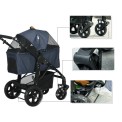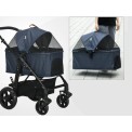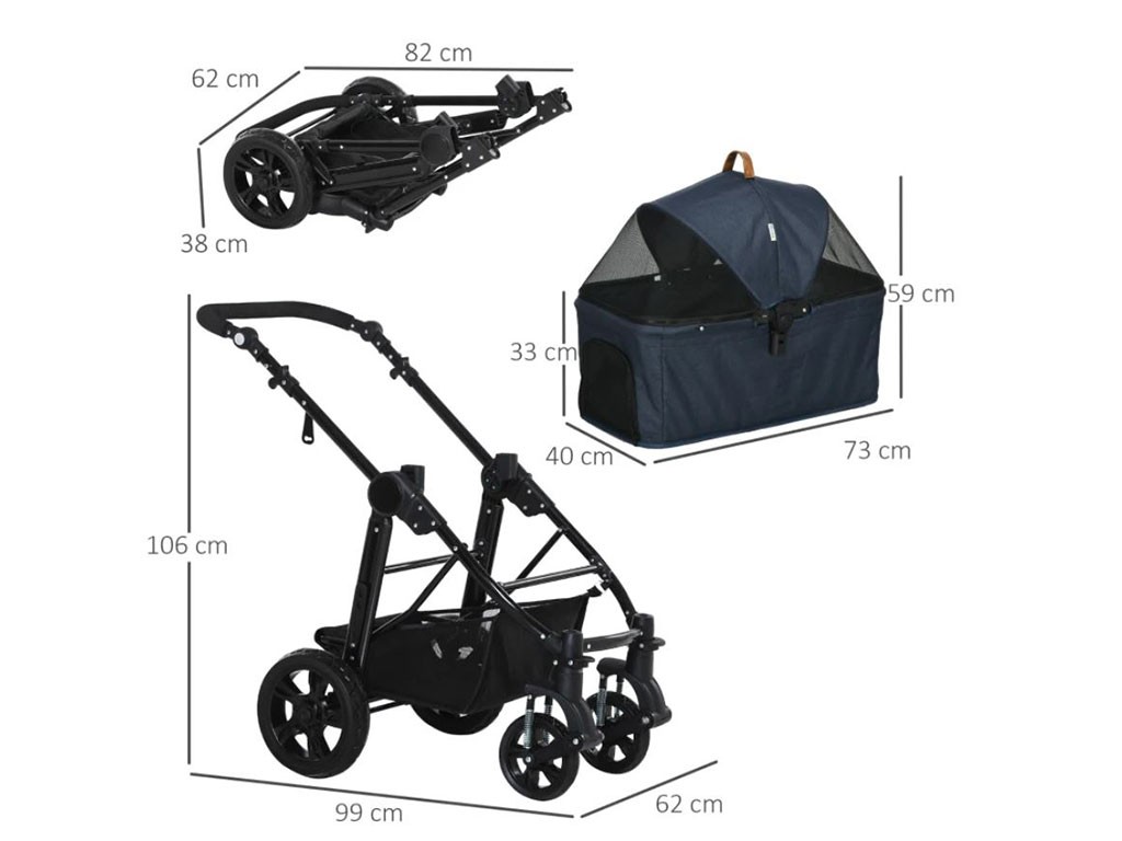 Wózek 2 w 1 dla psów do 10 kg, który może służyć również jako torba, regulowana rączka wózka , stalowa rama, pokrowiec z tkaniny Oxford, przednie i tylne okna z siatki , składana 4-stopniowa budka, drzwi z siatki zapinane na suwak, wyściełana powierzchnia do leżenia, 2 smycze zabezpieczające wewnątrz kosza, 2 obrotowe przednie koła ze sprężynami, 2 stałe tylne koła z hamulcami, wymiary kosza z daszkiem 73x40x59cm, wymiary wewnętrzne kosza 53x36x20cm, wymiary całkowite wózka 99x62x106cm.