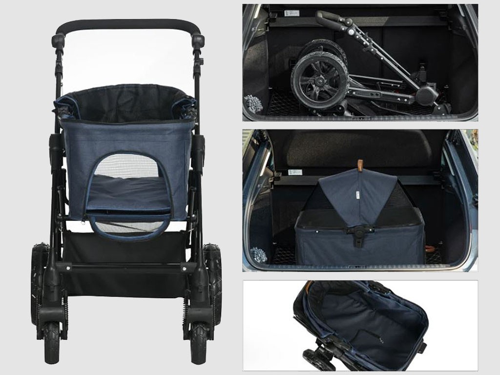Wózek jest łatwy w przechowywaniu. W kilka chwil można złożyć cały wózek i schować go lub przygotować do transportu samochodem. Koszyk można łatwo zdemontować z wózka, tworząc przenośną torbę dla psa, a stalową ramę można złożyć. Sam koszyk/torba również jest składana. Jeśli chcesz po prostu zapewnić psu doskonały widok podczas jazdy, wystarczy odpiąć i otworzyć 4-stopniowo składaną budkę.
