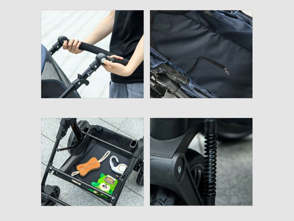 Dzięki 4-stopniowo składanemu dachowi, pies może być łatwo zamknięty w wózku, a dzięki siateczkowej przedniej i tylnej części budki, pies ma nie tylko dobry widok, ale także dostęp do świeżego powietrza. Budkę można łatwo zabezpieczyć , zapinając ją , aby pies nie mógł wyskoczyć, a także przypiąć psa do dwóch smyczy bezpieczeństwa wewnątrz wózka. Wyściełane dno wózka oferuje psu wygodne miejsce do leżenia podczas jazdy. W pozycji leżącej pies może obserwować otoczenie przez siatkowe przednie drzwiczki zapinane na suwak, które można otworzyć. Wózek ma również wystarczająco dużo miejsca do przechowywania psiego wyposażenia. Duża dolna kieszeń pod korpusem wózka służy do przechowywania większych przedmiotów , takich jak butelka z wodą, smycz, kocyk i inne psie akcesoria.
