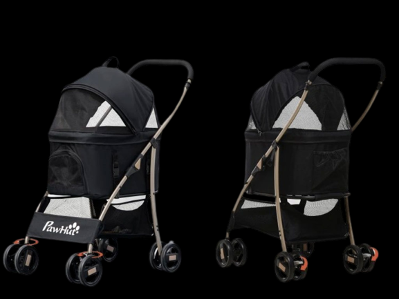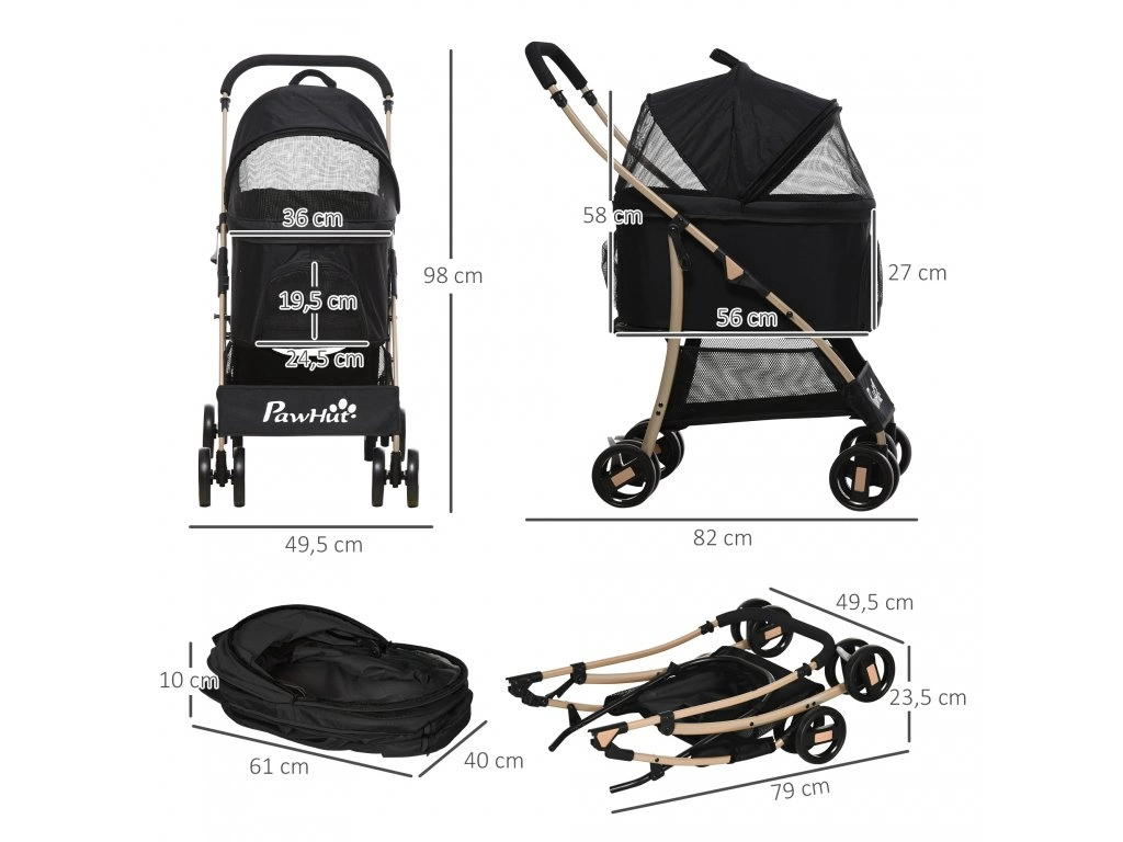 Wózek 2 w 1 dla psów do 10 kg, który może służyć również jako torba, stalowa rama, pokrowiec z tkaniny Oxford, przednie i tylne okna z siatki , składana 4-stopniowa budka, drzwi z siatki zapinane na suwak, wyściełana powierzchnia do leżenia, 2 smycze zabezpieczające w koszyku, 2 obrotowe przednie koła ze sprężynami, 2 stałe tylne koła z hamulcami, wymiary koszyka z daszkiem 56x36x58cm, całkowite wymiary wózka 82x49,5x98cm.