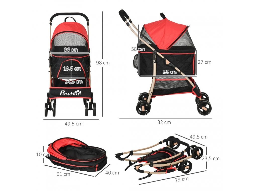 Wózek 2 w 1 dla psów do 10 kg, który może służyć również jako torba, stalowa rama, pokrowiec z tkaniny Oxford, przednie i tylne okna z siatki , składana 4-stopniowa budka, drzwi z siatki zapinane na suwak, wyściełana powierzchnia do leżenia, 2 smycze zabezpieczające w koszyku, 2 obrotowe przednie koła ze sprężynami, 2 stałe tylne koła z hamulcami, wymiary koszyka z daszkiem 56x36x58cm, całkowite wymiary wózka 82x49,5x98cm.