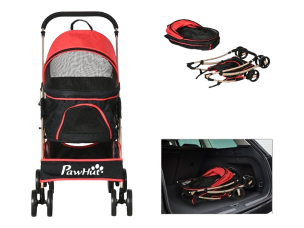 Wózek jest łatwy w przechowywaniu. W kilka chwil można złożyć cały wózek i schować go lub przygotować do transportu samochodem. Koszyk można łatwo zdemontować z wózka, tworząc przenośną torbę dla psa, a stalową ramę można złożyć. Sam koszyk/torba również jest składana. Jeśli chcesz po prostu zapewnić psu doskonały widok podczas jazdy, wystarczy odpiąć i otworzyć 4-stopniowo składaną budkę.