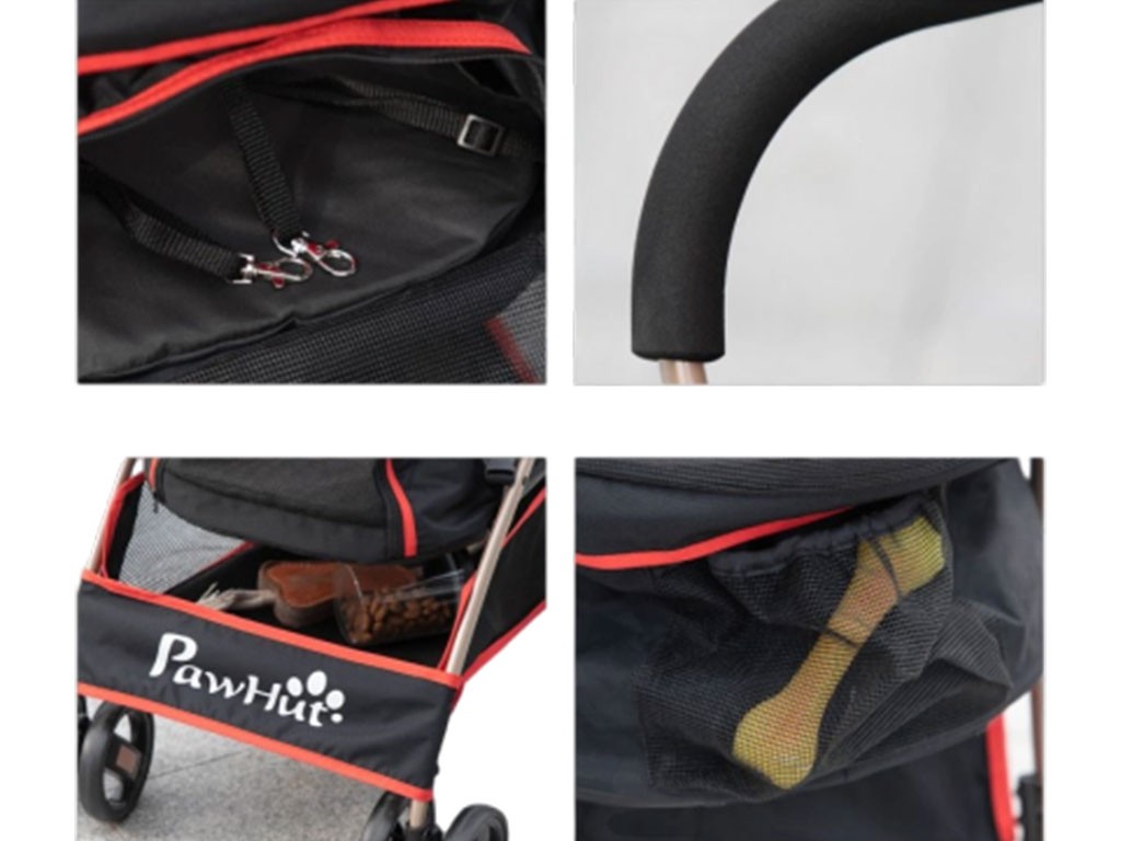 Dzięki 4-stopniowo składanemu dachowi, pies może być łatwo zamknięty w wózku, a dzięki siateczkowej przedniej i tylnej części budki, pies ma nie tylko dobry widok, ale także dostęp do świeżego powietrza. Budkę można łatwo zabezpieczyć , zapinając ją , aby pies nie mógł wyskoczyć, a także przypiąć psa do dwóch smyczy bezpieczeństwa wewnątrz wózka. Wyściełane dno wózka oferuje psu wygodne miejsce do leżenia podczas jazdy. W pozycji leżącej pies może obserwować otoczenie przez siatkowe przednie drzwiczki zapinane na suwak, które można otworzyć. Wózek ma również wystarczająco dużo miejsca do przechowywania psiego wyposażenia. Duża dolna kieszeń pod korpusem wózka służy do przechowywania większych przedmiotów , takich jak butelka z wodą, smycz, kocyk i inne psie akcesoria.