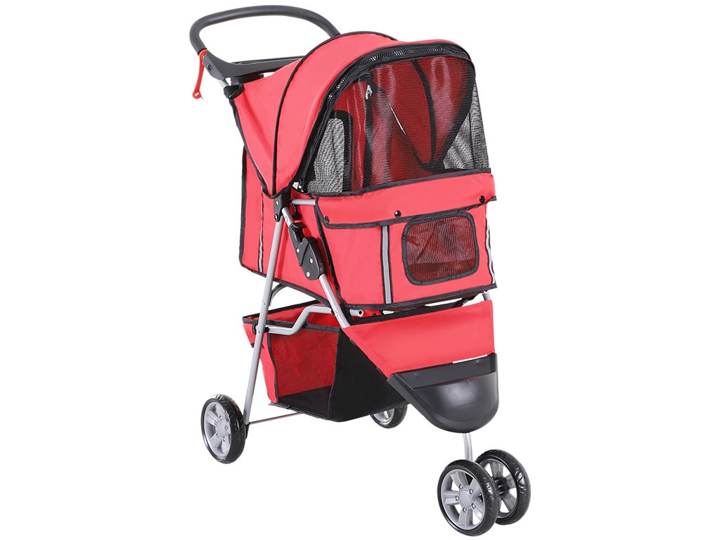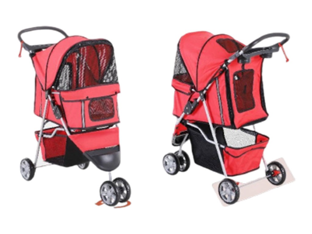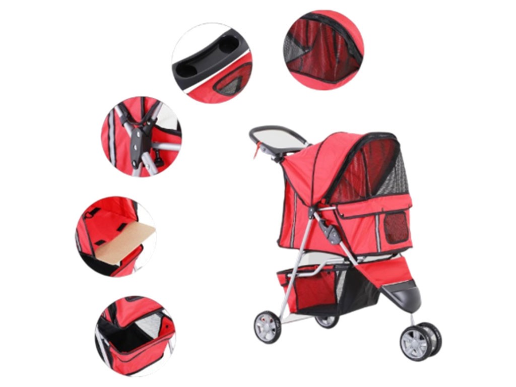 Wózek dla psów do 10 kg, 2 uchwyty na butelki, stalowa rama, poszycie z tkaniny Oxford, składany daszek przeciwsłoneczny, przednie drzwi z siatki z zamkiem błyskawicznym , tylne drzwi z torbą zapinaną na zamek, 2 smycze zabezpieczające w środku, podwójne obrotowe koła przednie, 2 podwójne stałe koła tylne z hamulcami, wymiary wewnętrzne z daszkiem 55x32x52cm, wymiary całkowite wózka 75x45x97cm.