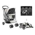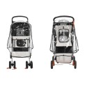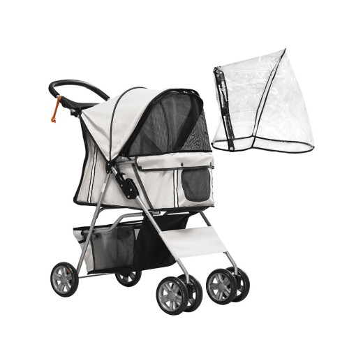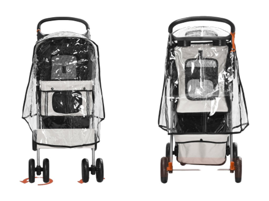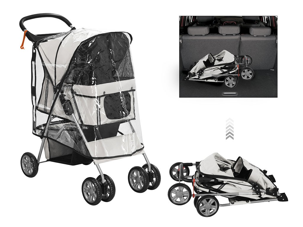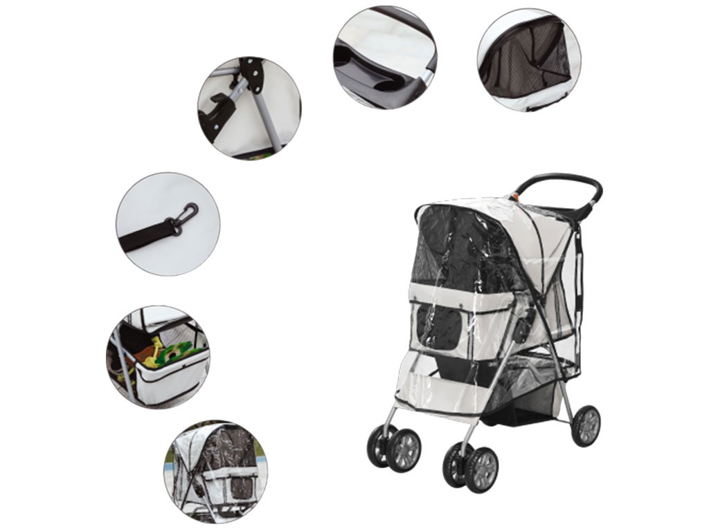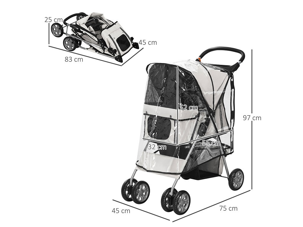 Wózek dla psów do 10 kg, z pokrowcem przeciwdeszczowym, 2 uchwytami na butelki, stalową ramą, pokrowcem z tkaniny Oxford, składanym daszkiem przeciwsłonecznym, przednimi drzwiami z siatki z zamkiem błyskawicznym , tylnymi drzwiami z torbą zapinaną na zamek, 2 smyczami bezpieczeństwa w środku, podwójnymi obrotowymi kołami z przodu, 2 podwójnymi stałymi kołami z tyłu z hamulcami, wymiary wewnętrzne z daszkiem 55x32x52 cm, wymiary całkowite wózka 75x45x97 cm.