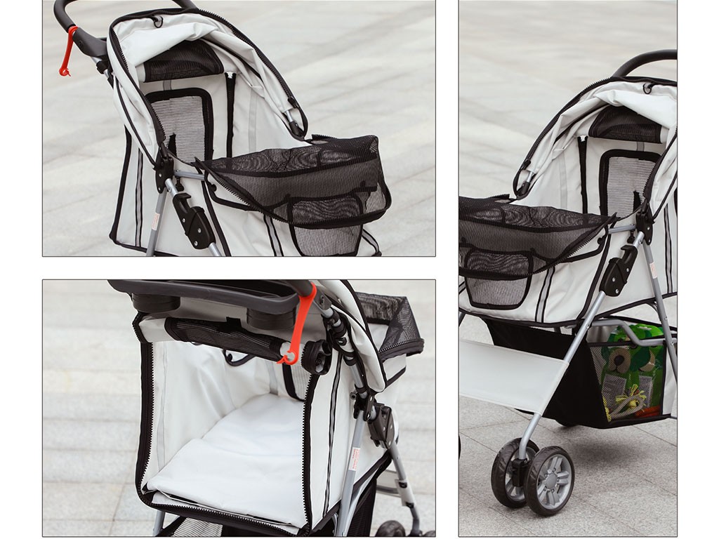Ze składanym dachem przesuwnym Psa można łatwo zamknąć w wózku, a dzięki dużemu, siatkowemu okienku w budce i siatkowym drzwiczkom, pies nie tylko ma dobry widok, ale także dostęp do świeżego powietrza. Trzymanie psa będzie… Przednie i tylne drzwi zapinane na suwak są łatwe w otwieraniu , a następnie można przypiąć psa do dwóch smyczy bezpieczeństwa wewnątrz wózka. Wózek oferuje również dużo miejsca do przechowywania psiego wyposażenia. Duża dolna kieszeń pod korpusem wózka służy do przechowywania większych przedmiotów , takich jak butelka z wodą, smycz, kocyk i inne psie akcesoria. Praktyczna kieszeń zapinana na suwak na tylnych drzwiach jest zawsze pod ręką, aby pomieścić drobiazgi, takie jak smakołyki czy dokumenty.