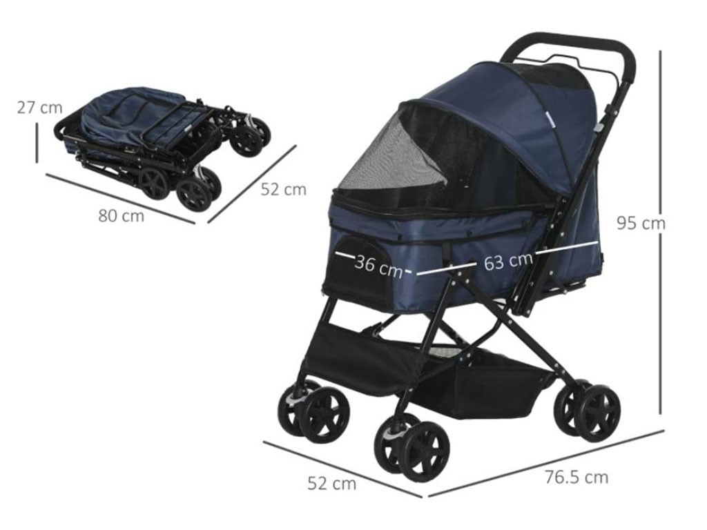Wózek dla psów do 10 kg, z wyborem kierunku jazdy, stalowa rama, pokrowiec z tkaniny Oxford, składana 3-stopniowa budka zapinana na zamek, przednie drzwi z siatki zapinane na zamek , tylne drzwi z torbą zapinaną na zamek, 2 smycze zabezpieczające w środku, podwójne obrotowe koła przednie, 2 podwójne stałe koła tylne z hamulcami, wymiary wewnętrzne z daszkiem 63x36x51 cm, wymiary wewnętrzne koszyka 63x36x20 cm, wymiary całkowite wózka 76,5x52x95 cm.