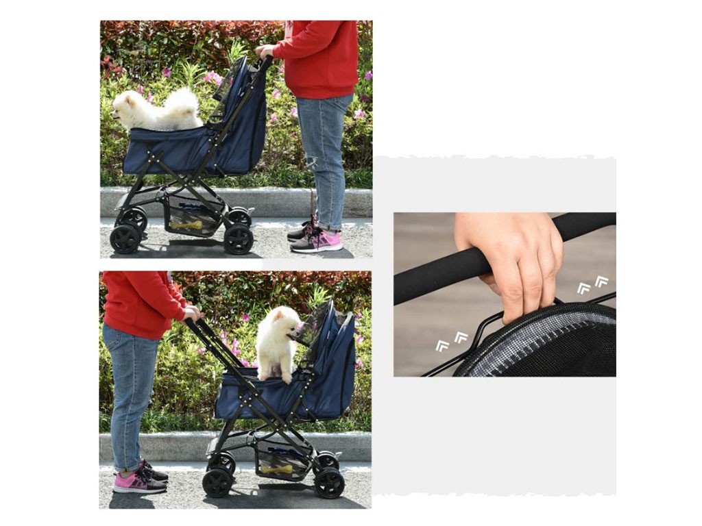 Dzięki 3-stopniowemu, rozsuwanemu dachowi, pies może być łatwo zamknięty w wózku, a dzięki dużemu, siatkowemu okienku w dachu i siatkowym drzwiom, pies ma nie tylko dobry widok, ale także dostęp do świeżego powietrza. Trzymanie psa będzie… Przednie i tylne drzwi zapinane na suwak są łatwe w otwieraniu , a następnie można przypiąć psa do dwóch smyczy bezpieczeństwa wewnątrz wózka. Wózek oferuje również dużo miejsca do przechowywania psiego wyposażenia. Duża dolna kieszeń pod korpusem wózka służy do przechowywania większych przedmiotów , takich jak butelka z wodą, smycz, kocyk i inne psie akcesoria. Praktyczna kieszeń zapinana na suwak na tylnych drzwiach jest zawsze pod ręką, aby pomieścić drobiazgi, takie jak smakołyki czy dokumenty.