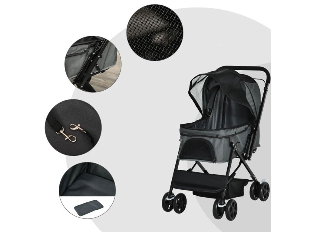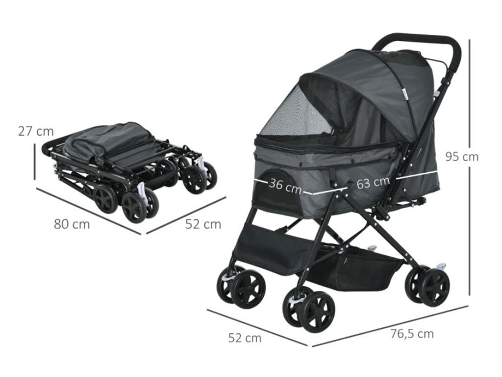 Wózek dla psów do 10 kg, z wyborem kierunku jazdy, stalowa rama, pokrowiec z tkaniny Oxford, składana 3-stopniowa budka zapinana na zamek, przednie drzwi z siatki zapinane na zamek , tylne drzwi z torbą zapinaną na zamek, 2 smycze zabezpieczające w środku, podwójne obrotowe koła przednie, 2 podwójne stałe koła tylne z hamulcami, wymiary wewnętrzne z daszkiem 63x36x51 cm, wymiary wewnętrzne koszyka 63x36x20 cm, wymiary całkowite wózka 76,5x52x95 cm.