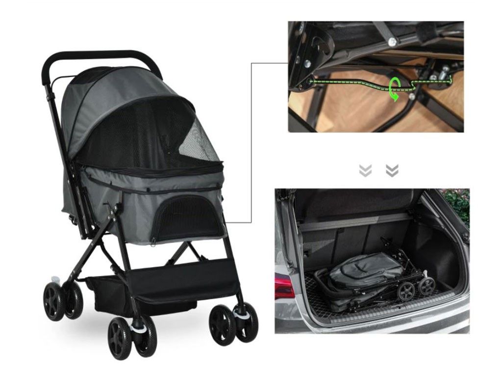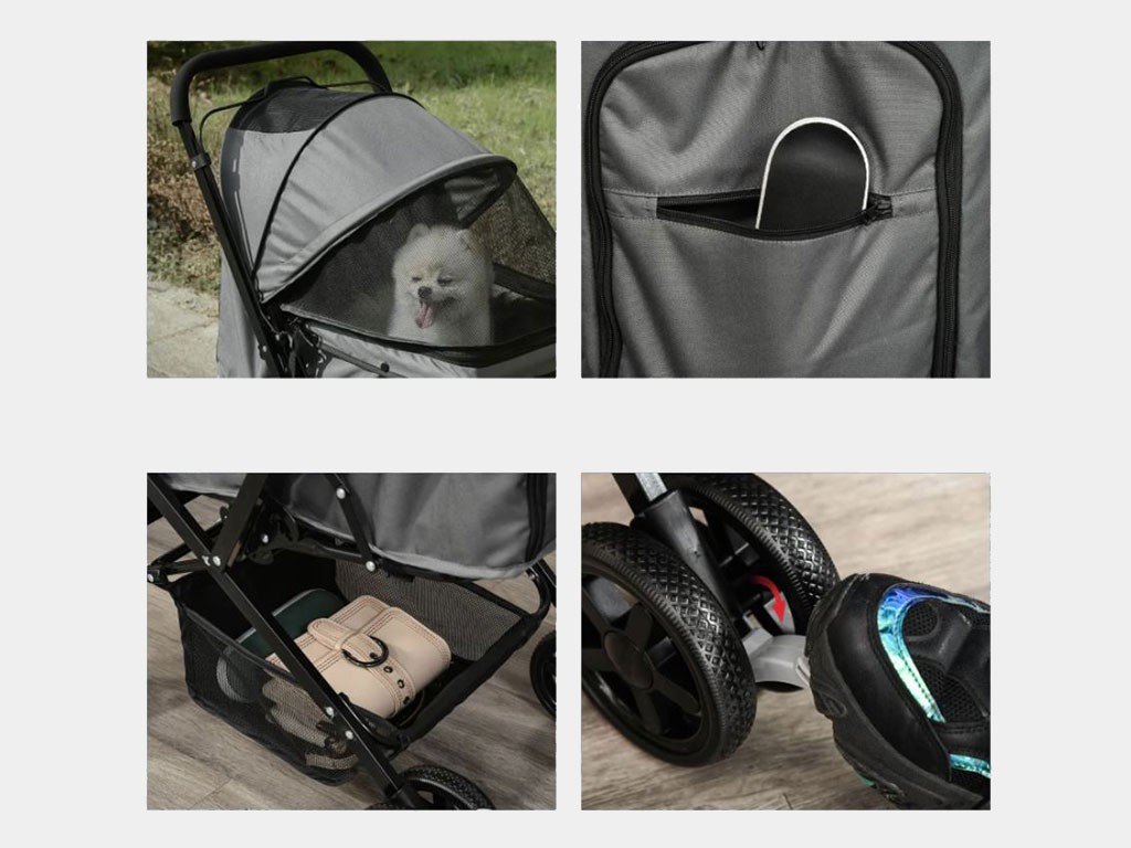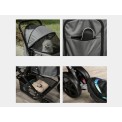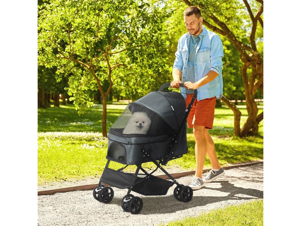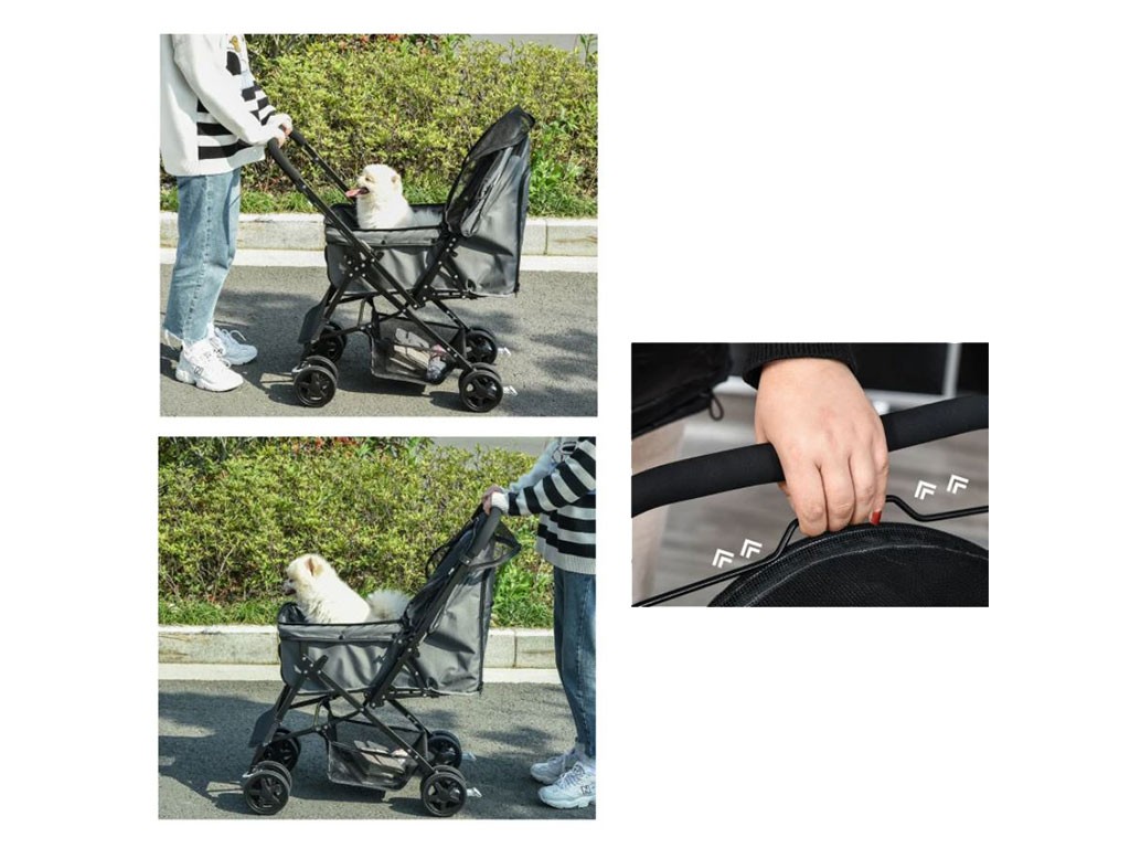 Dzięki 3-stopniowemu, rozsuwanemu dachowi, pies może być łatwo zamknięty w wózku, a dzięki dużemu, siatkowemu okienku w dachu i siatkowym drzwiom, pies ma nie tylko dobry widok, ale także dostęp do świeżego powietrza. Trzymanie psa będzie… Przednie i tylne drzwi zapinane na suwak są łatwe w otwieraniu , a następnie można przypiąć psa do dwóch smyczy bezpieczeństwa wewnątrz wózka. Wózek oferuje również dużo miejsca do przechowywania psiego wyposażenia. Duża dolna kieszeń pod korpusem wózka służy do przechowywania większych przedmiotów , takich jak butelka z wodą, smycz, kocyk i inne psie akcesoria. Praktyczna kieszeń zapinana na suwak na tylnych drzwiach jest zawsze pod ręką, na drobne przedmioty , takie jak smakołyki czy dokumenty.
