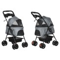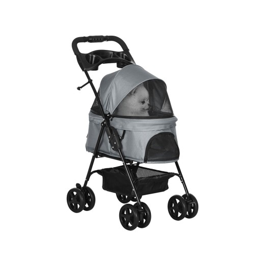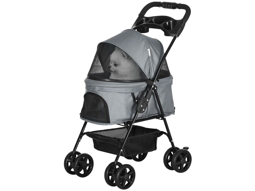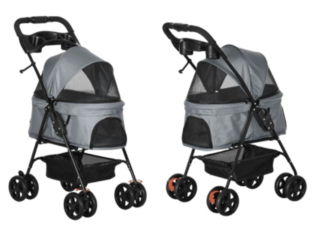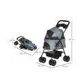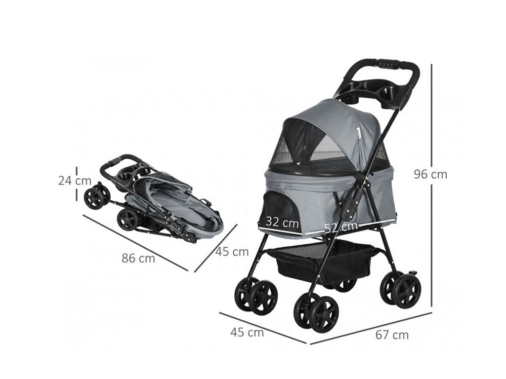 Wózek dla psów do 4 kg, 2 uchwyty na butelki, stalowa rama, pokrowiec z tkaniny Oxford, składany daszek przeciwsłoneczny, przednie drzwi z siatki z zamkiem błyskawicznym , tylne drzwi z torbą zapinaną na zamek, 2 smycze zabezpieczające w środku , podwójne obrotowe koła przednie, 2 podwójne stałe koła tylne z hamulcami, wymiary wewnętrzne z daszkiem 52x32x48 cm, wymiary całkowite wózka 67x45x96 cm.