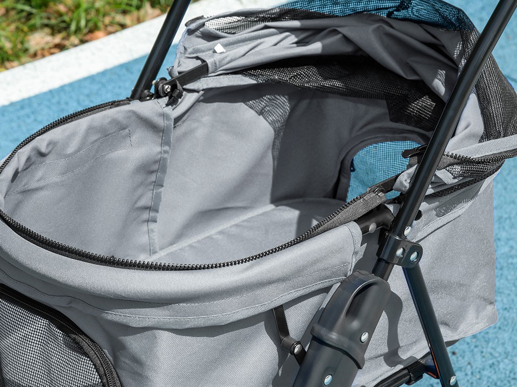 Wózek jest łatwy w przechowywaniu. W kilka chwil możesz złożyć cały wózek i schować go lub przygotować do transportu samochodem. Jeśli chcesz po prostu zapewnić psu doskonały widok podczas jazdy, wystarczy rozpiąć i otworzyć składany dach.