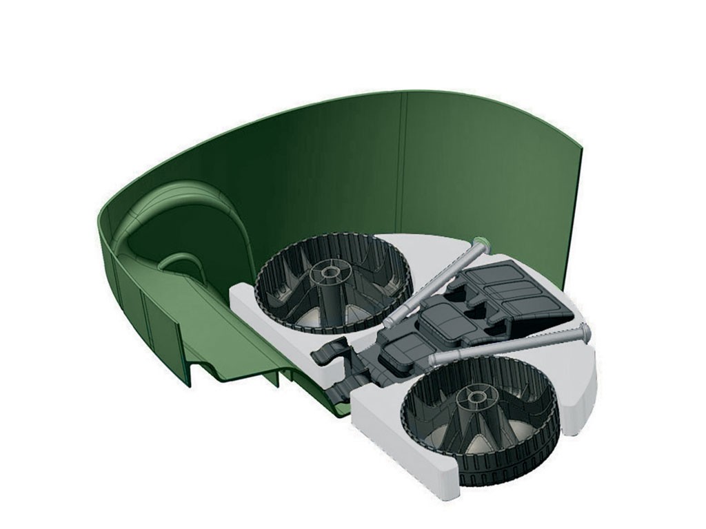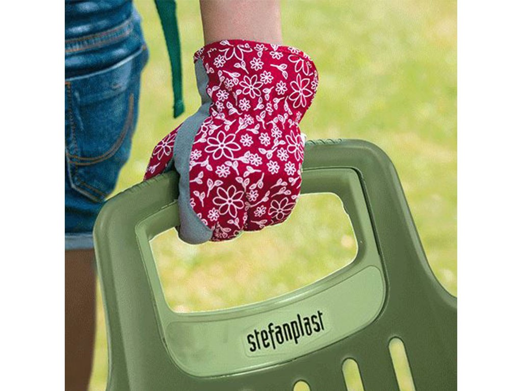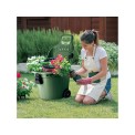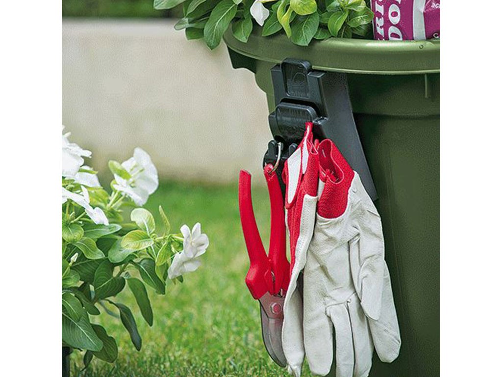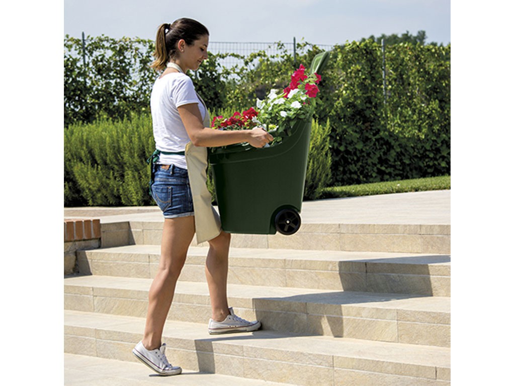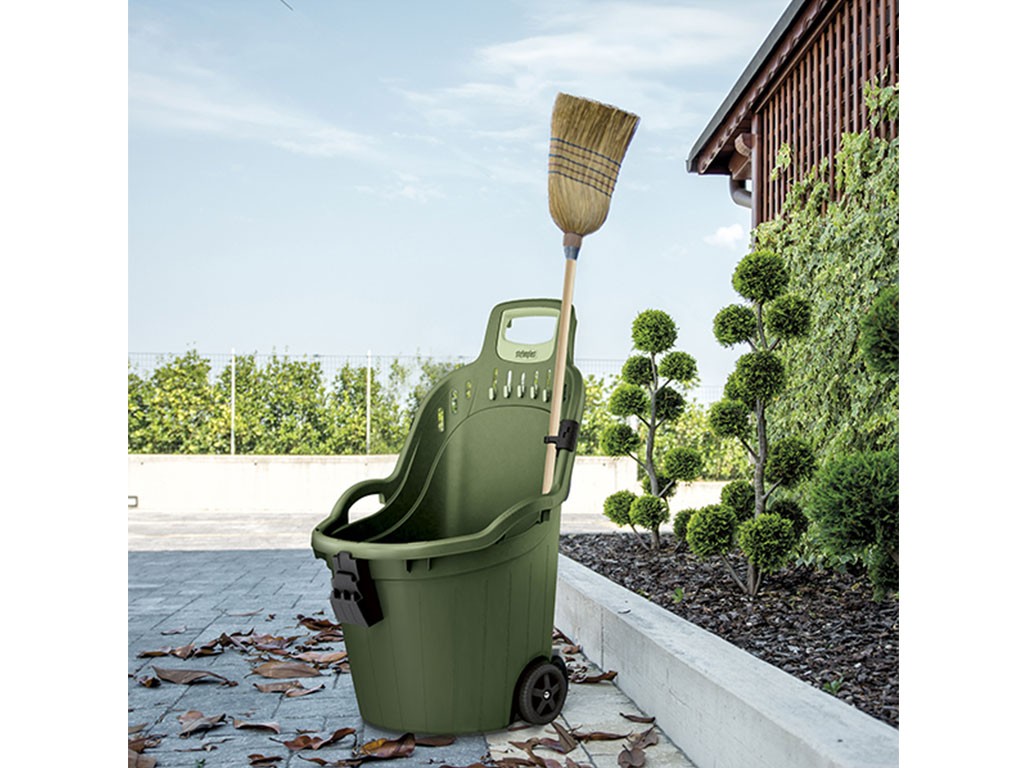 Ten wózek ogrodowy ma koła, schowek i wieszak w jednym. Dzięki dużym, wytrzymałym kołom wózek z łatwością poradzi sobie z jazdą po trawie lub nierównym terenie. Można go używać do przewożenia liści lub gałęzi , a dzięki udźwigowi do 60 kg można nim również przewozić ziemię lub piasek. Po zakończeniu pracy wózek można wykorzystać jako schowek na narzędzia .