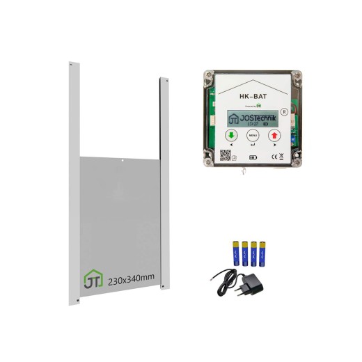 JOSTechnik HK-Bat 23x34 D to praktyczny zestaw do automatycznego otwierania i zamykania kurników oraz trwałych drzwi. Urządzenie posiada mocny silnik , który podnosi drzwi o wadze do 2 kg . Urządzenie wyposażone jest w trwałą obudowę , zapewniającą ochronę przed warunkami atmosferycznymi. Wszystkie niezbędne informacje o ustawieniach są czytelnie wyświetlane. NA Wyświetlacz LCD . Wyświetlacz LCD przechodzi w tryb uśpienia po pewnym okresie bezczynności, aby wydłużyć jego żywotność. Urządzenie można wybudzić, naciskając dowolny przycisk.