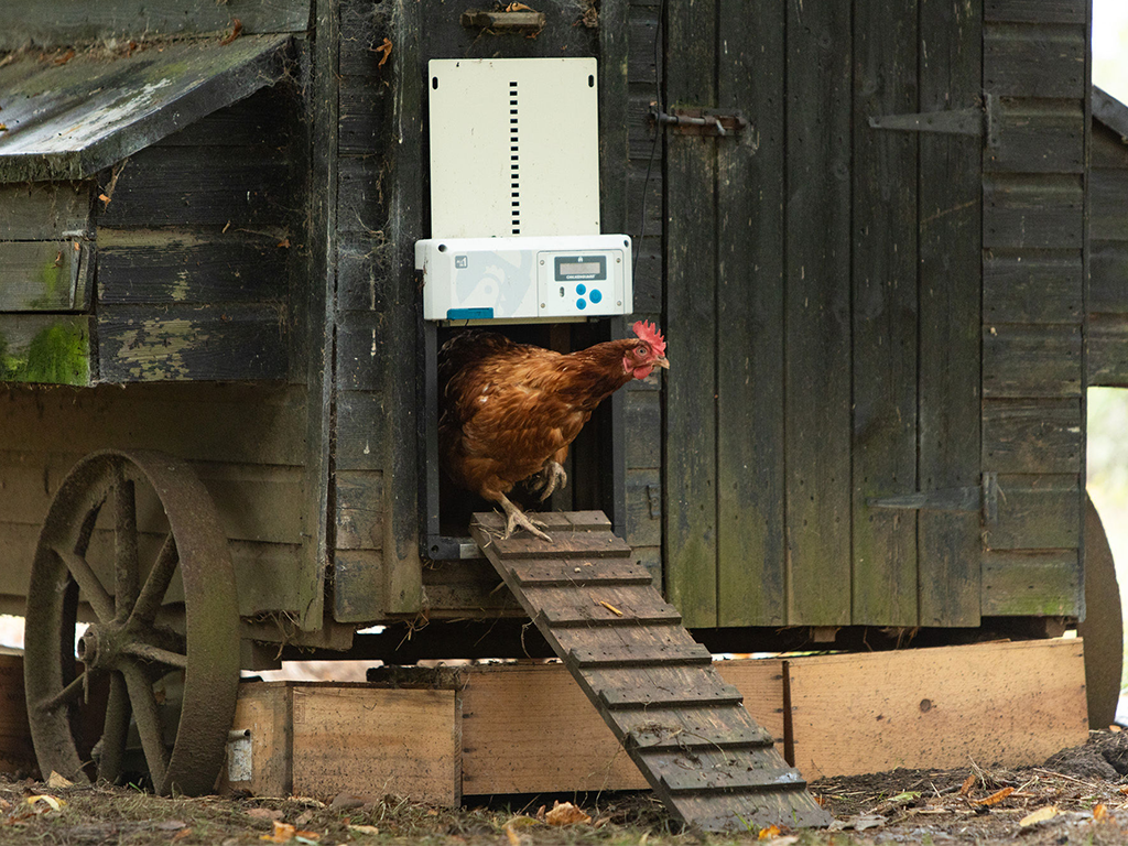 - Czujnik światła - drzwi kurnika otwierają się o świcie i zamykają o zmierzchu, zależnie od ilości światła dziennego.