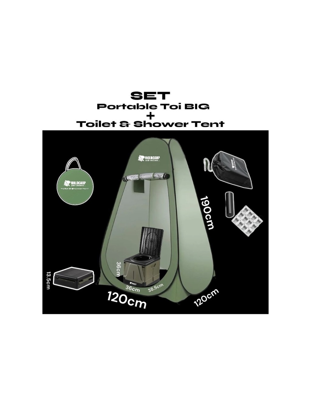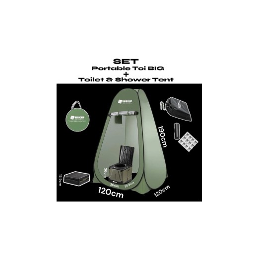 Praktyczny i wygodny zestaw higieniczny na kemping , podróż lub wyprawę. Zawiera dużą, przenośną, składaną toaletę oraz samoskładający się namiot toaletowo-prysznicowy , który zapewni mnóstwo przestrzeni i prywatności w każdym otoczeniu – niezależnie od tego, czy jesteś na kempingu, nad wodą, czy na festiwalu.