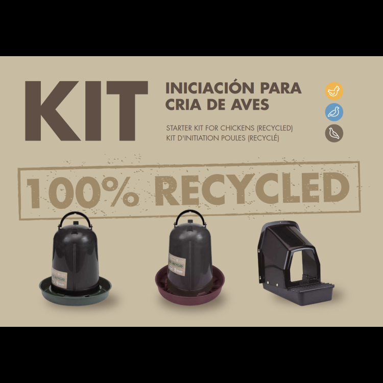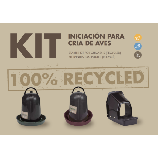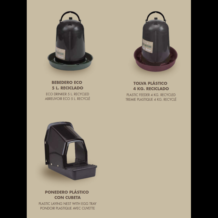Podstawowy zestaw dla początkujących hodowców kur niosek – ECO Plastikowe Gniazdo Nieśne Standard, Karmnik ECO 4 kg i Poidło ECO 5 litrów. Wersja ECO wykonana z materiałów pochodzących z recyklingu. Wyprodukowano w UE.